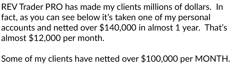 As of a few months ago, I’m no longer working with any trading firms. I’m on my own. I’ve decided to switch sides. I’m dedicating the rest of my life to help those who have been abused by our financial system. At one point or another you probably have experienced financial struggles, debt, job loss, family problems, and the list goes on. Early in my life, I experienced the same, and that’s another reason why I want to help you. The markets can and do change and new opportunities arise. Because of this I’m constantly perfecting my trading strategies especially REV Trader PRO… one of my all-time favorites and most profitable systems. I’m always discovering new ways to improve the settings and the strategy. Which is why REV Trader PRO will continue to work into the future; I pass off these updates and improvements to you.